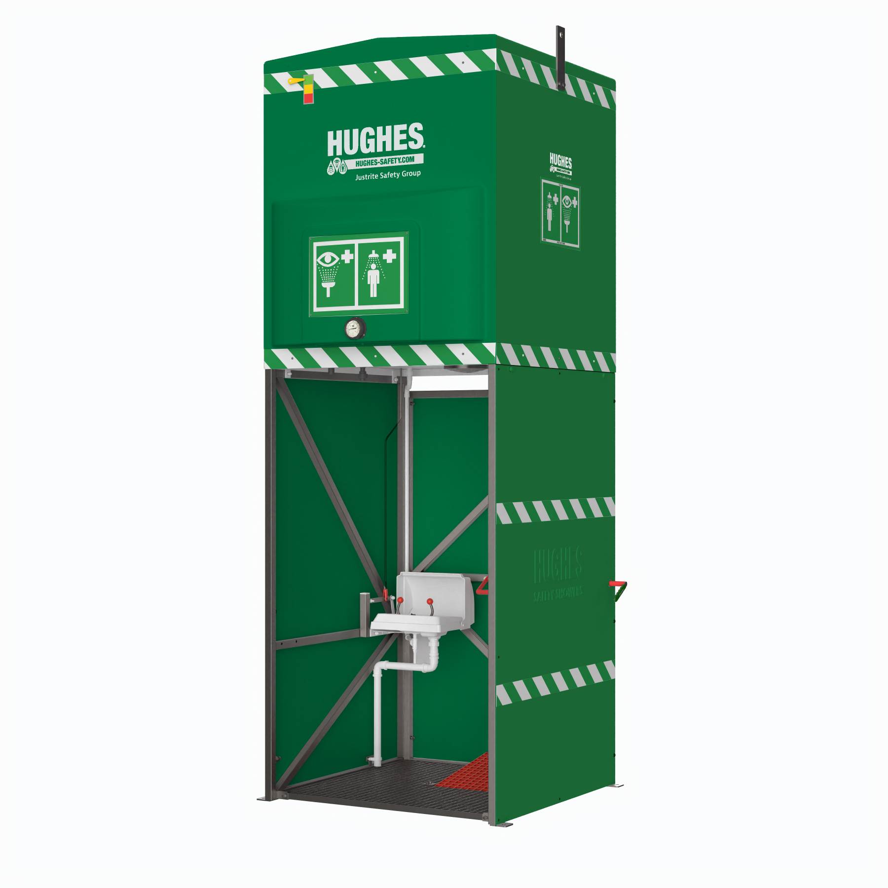 De tankdouche is voorzien een elektrisch verwarmingselement (240V) met weerstand en dubbele veiligheidsthermostaat. De regelthermostaat wordt ingesteld op 21°C. De nooddouche is aan de voorzijde uitgerust met een pictogrambox 'oog en nooddouche'. Optioneel kan verlichting worden voorzien in de pictogrambox.