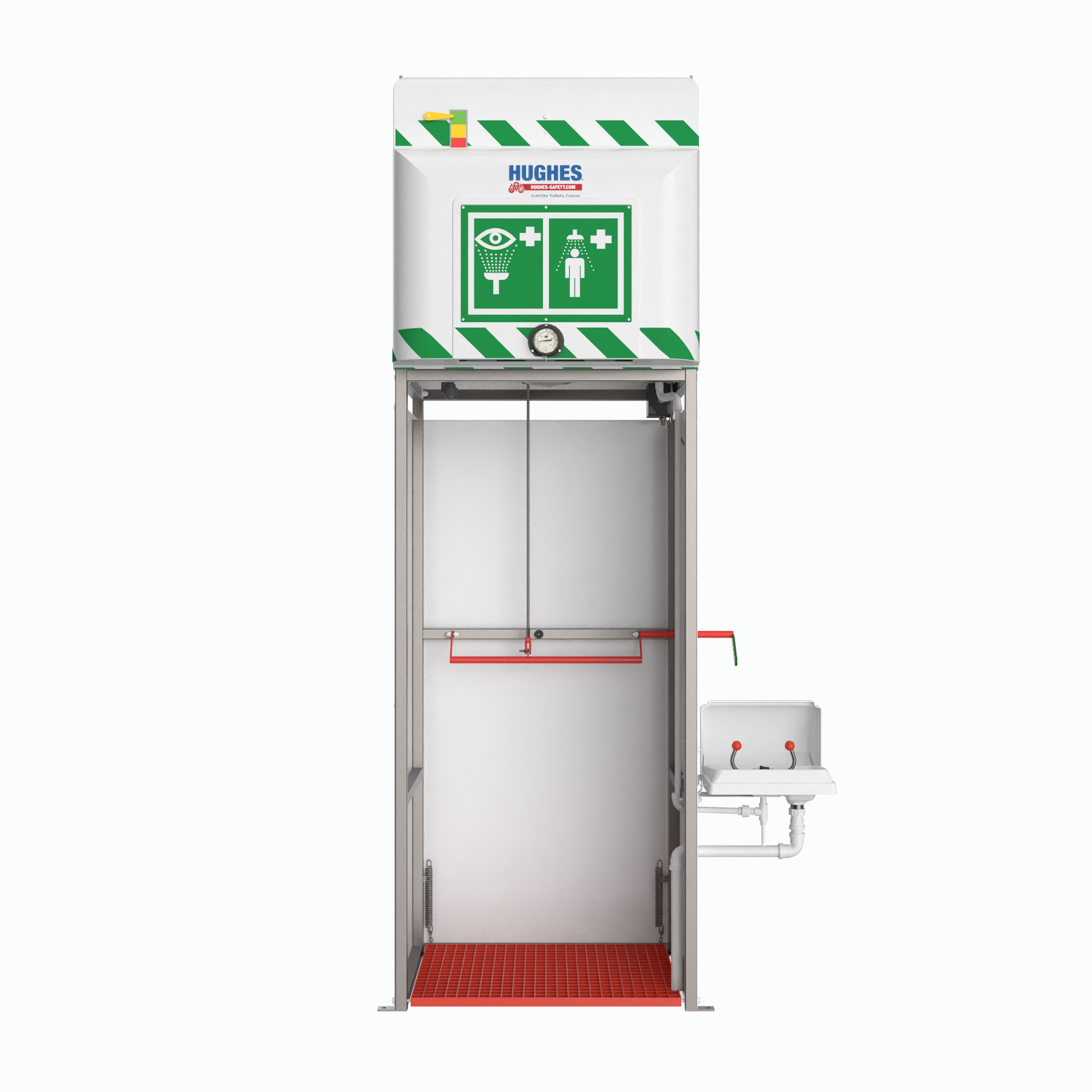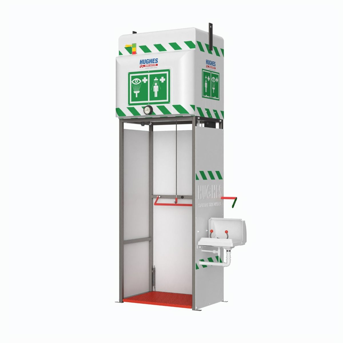 De tankdouche is voorzien een elektrisch verwarmingselement (240V) met weerstand en dubbele veiligheidsthermostaat. De regelthermostaat wordt ingesteld op 21°C. De nooddouche is aan de voorzijde uitgerust met een pictogrambox 'oog en nooddouche'. Optioneel kan verlichting worden voorzien in de pictogrambox.
