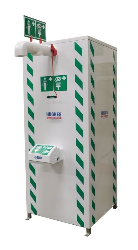 De plensdouche bovenaan bestaat uit RVS 316 waterleidingen, voorzien van elektrische tracing, isolatie en een buitenste omkasting uit polyethyleen. Activatie gebeurt via een trekhendel. De vorstvrije ABS-oogdouche met geïntegreerde debietregelaar wordt geactiveerd door het openen van het deksel. Omwille van het deksel blijft de oogdouche gevrijwaard van vuil en stof. De interne waterleidingen zijn vervaardigd uit RVS 316. De buitenkast bestaat uit glasvezelversterkt polyester. De aangebrachte veiligheidspictogrammen voldoen aan de geldende internationale normen.