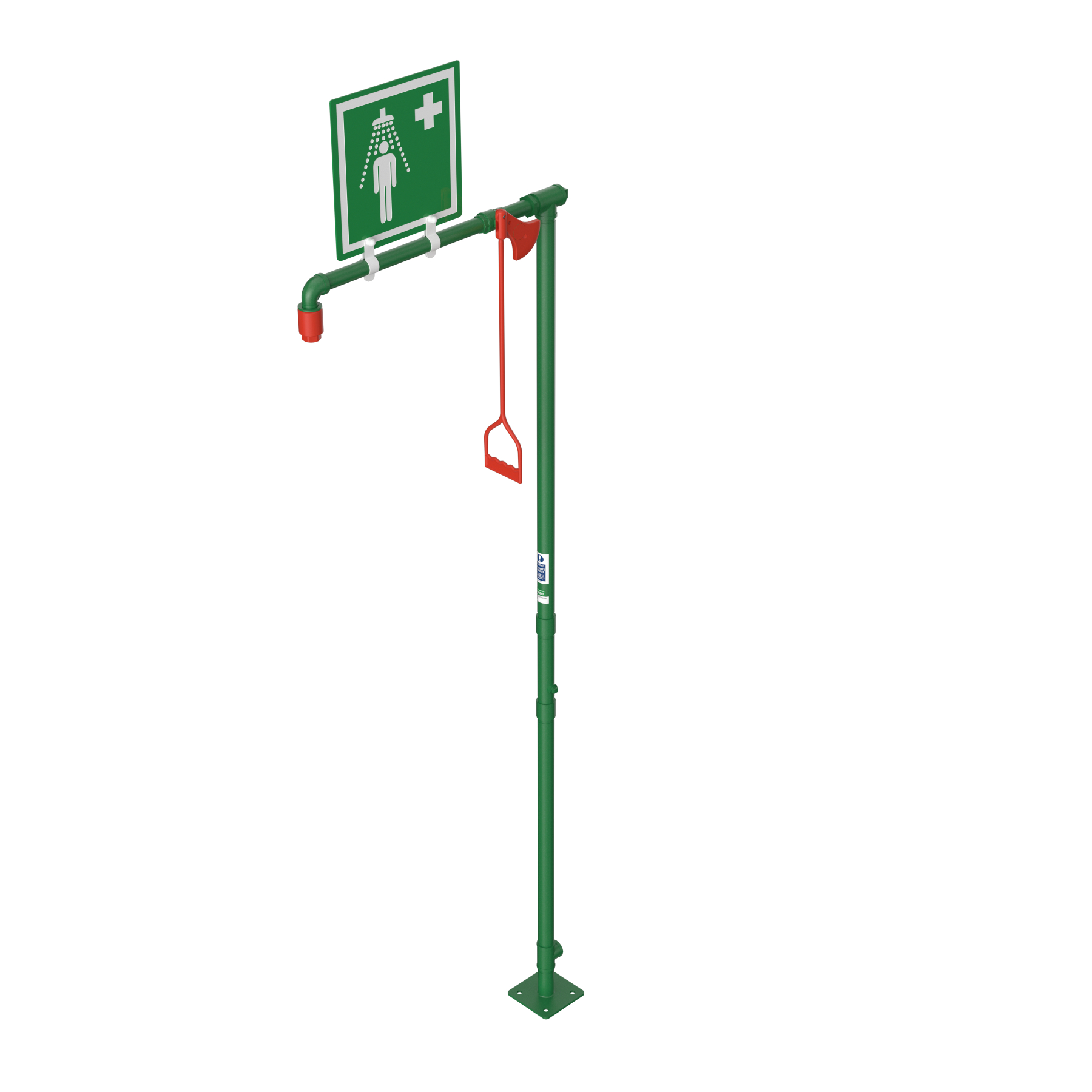 Onverwarmde, vrijstaande gegalvaniseerd stalen en groengelakte nooddouche. De nooddouche wordt geactiveerd door middel van een trekhendel. De afsluiters die gebruikt worden zijn steeds van RVS 316. De watertoevoer zit standaard onderaan.