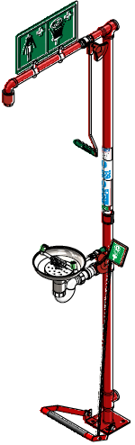 Onverwarmde, vrijstaande gegalvaniseerd stalen en roodgelakte nooddouche met gecombineerde open oogdouche uit RVS met debietregelaar. De plensdouche wordt geactiveerd door middel van een trekhendel. De oogdouche wordt geactiveerd door een duwhendel. Door de kracht van de waterdruk worden de afdekkapjes op de sproeikopjes van de oogdouche automatisch verwijderd. De standaardoriëntatie van de oogdouche is vooraan. Links, rechts of achteraan is eveneens mogelijk. De afsluiters die gebruikt worden zijn steeds van RVS 316. De watertoevoer zit standaard bovenaan.