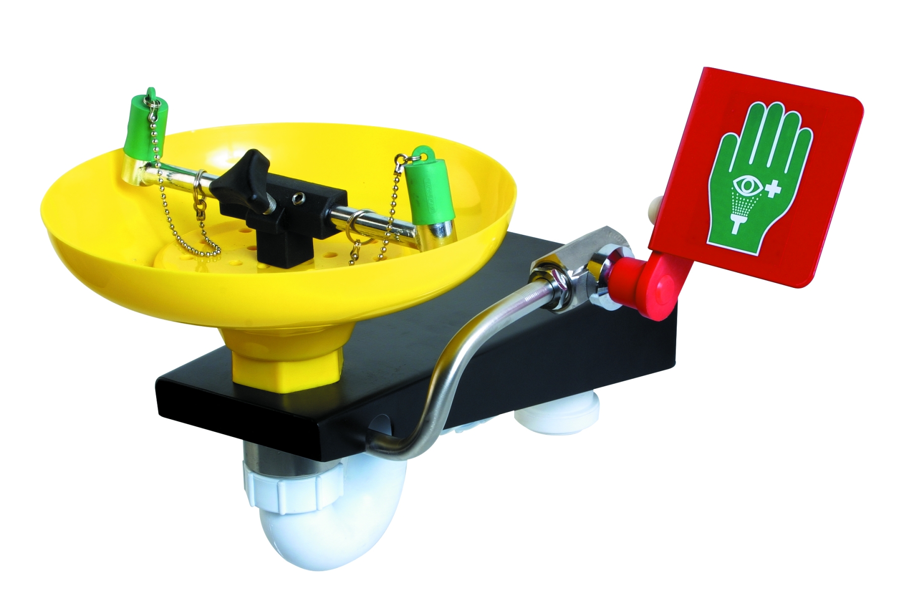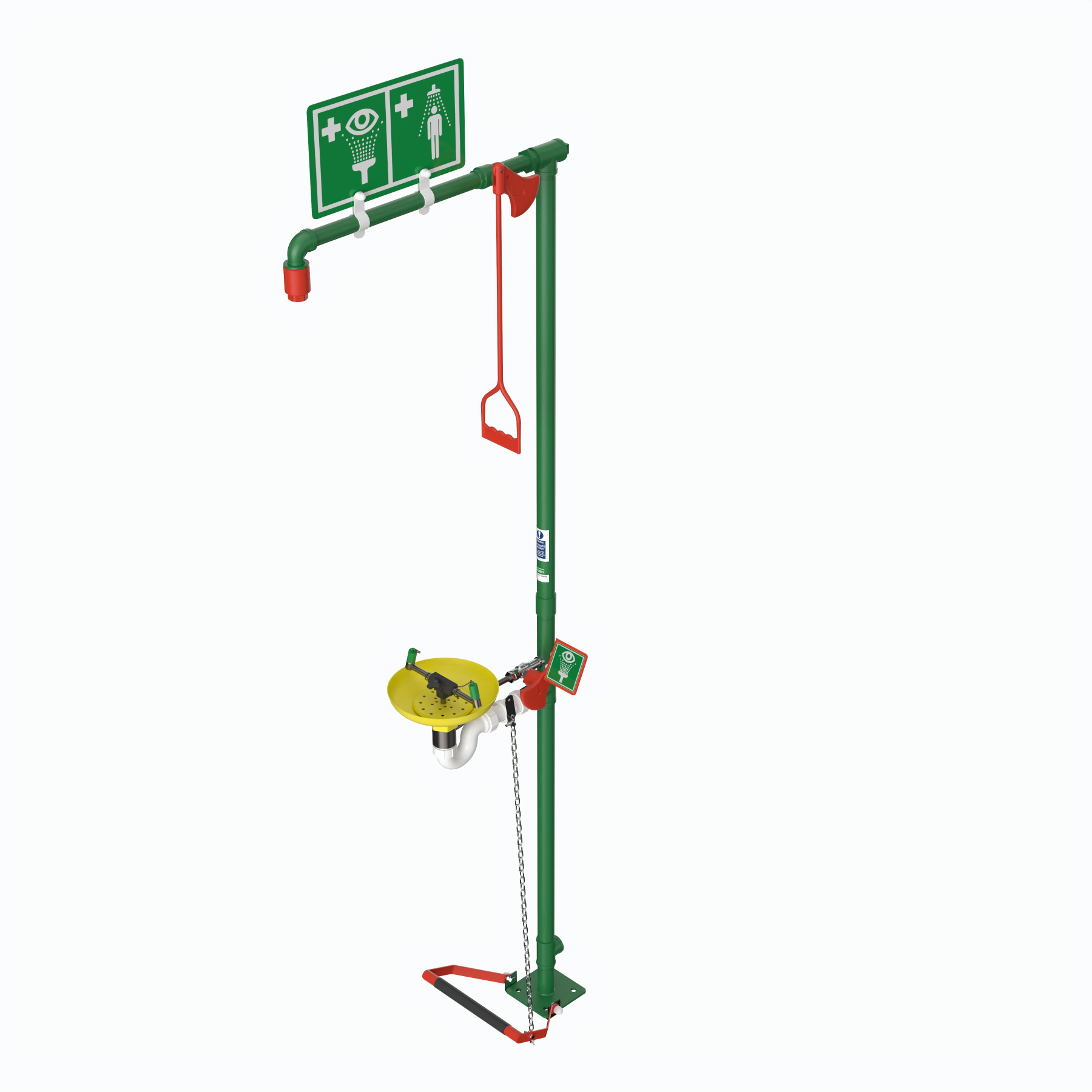 De plensdouche activeert u eenvoudig met een trekhendel, terwijl de oogdouche werkt via een duwhendel. Door de waterdruk worden de afdekkapjes op de sproeikoppen van de oogdouche automatisch verwijderd bij gebruik.