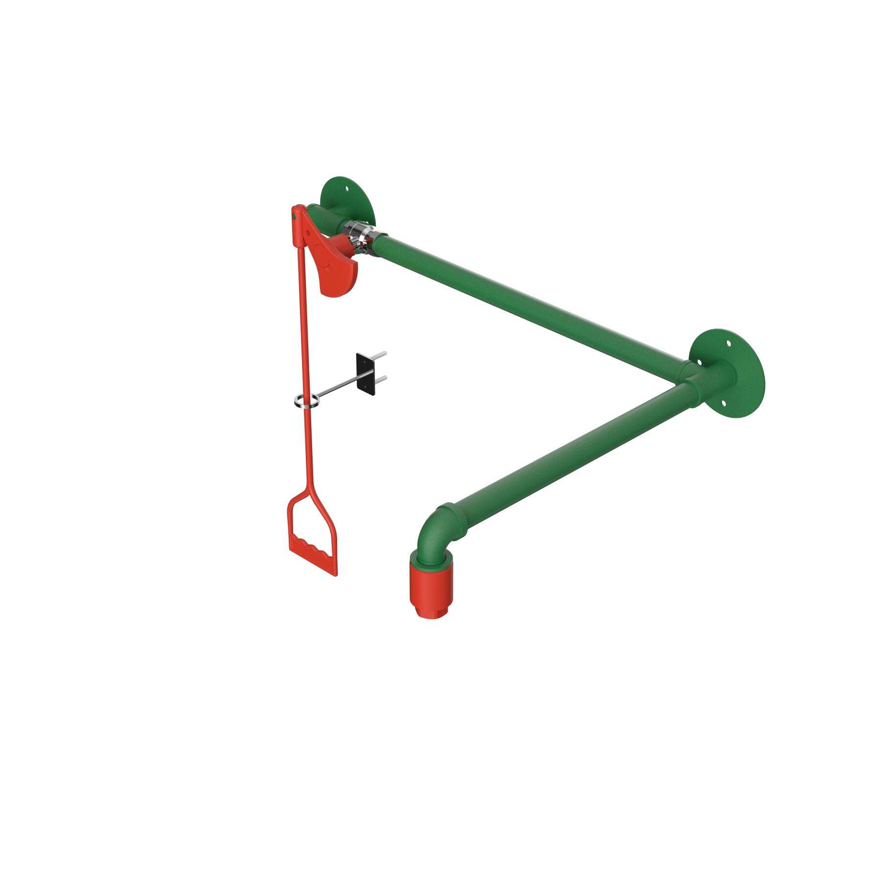 Onverwarmde, gegalvaniseerd stalen en groengelakte nooddouche met muurmontageplaat om te bevestigen boven een deur. De nooddouche wordt geactiveerd door middel van een trekhendel. De afsluiters die gebruikt worden zijn steeds van RVS 316.