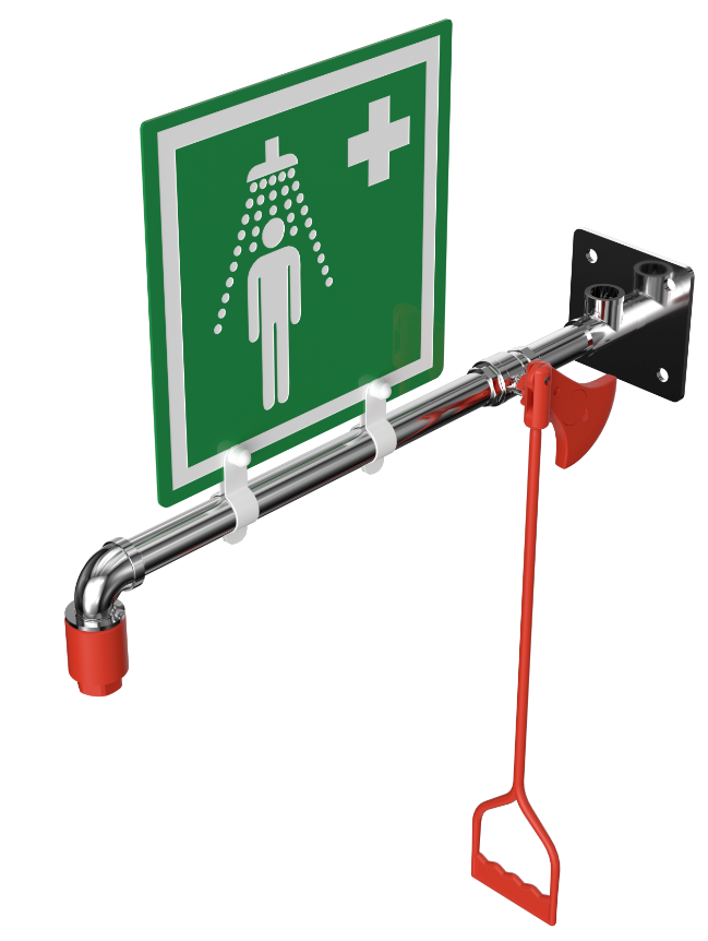Roestvrijstalen 316 nooddouche voor muurbevestiging met muurmontageplaat. De nooddouche wordt geactiveerd door middel van een trekhendel. De afsluiter die gebruikt worden zijn steeds van RVS 316.