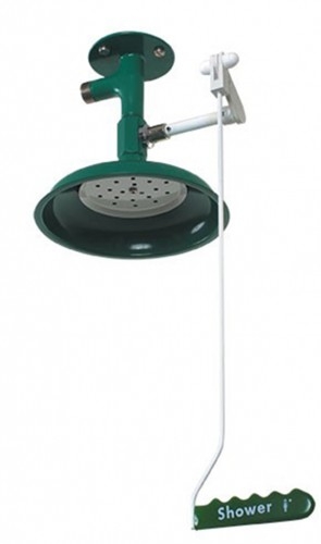 Onverwarmde roestvrij stalen 316 nooddouche voor plafondbevestiging gecoat in groene corrosie werende polyestercoating De nooddouche is gecombineerd met een RVS sproeiroos die eveneens voorzien is van een groene corrosie werende polyestercoating.