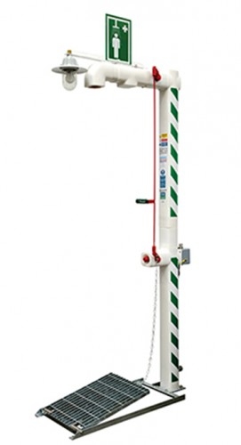 EXP-AH-5GS/10G, vorstvrij elektrisch getracete nooddouche bestaande uit roestvrij stalen 316 waterbuizen met daarrond een elektrische tracing, een isolatie en een buitenste omkasting in witte polyethyleen met groen/witte veiligheidsstrepen, (240V). De nooddouche is voorzien van een extra lichaamssproeier in het midden van de nooddouche.