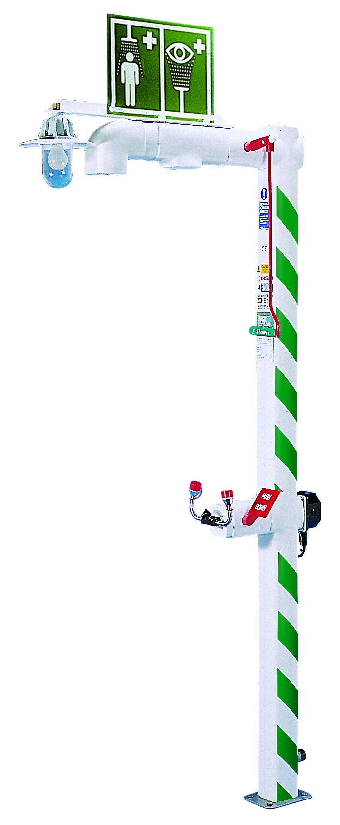 De plensdouche wordt geactiveerd door middel van een trekhendel. De nooddouche is gecombineerd met een 'Cow Horn' oogdouche zonder kom en wordt geactiveerd door een duwhendel. De oogdouche is voorzien van een debietregelaar. De sproeikopjes zijn voorzien van stopkapjes die automatisch verwijderd worden door de druk van het water tijdens activatie. Deze nooddouche is vorstvrij tot en met -20°C en standaard geschikt voor ATEX ZONES 1&2.