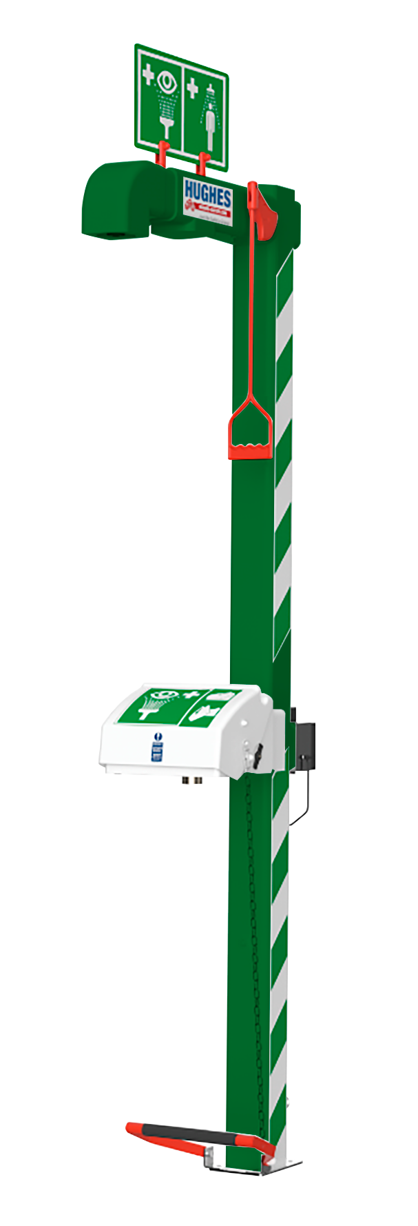 Deze nooddouche bestaat uit roestvrijstalen 316 waterbuizen met elektrische tracing, isolatie en een buitenste omkasting in groene polyethyleen met groen-witte veiligheidsstrepen. (240V)