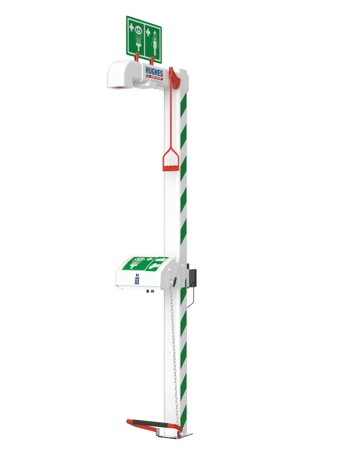 Deze nooddouche bestaat uit roestvrijstalen 316 waterbuizen met elektrische tracing, isolatie en een buitenste omkasting in witte polyethyleen met groen-witte veiligheidsstrepen. (240V)