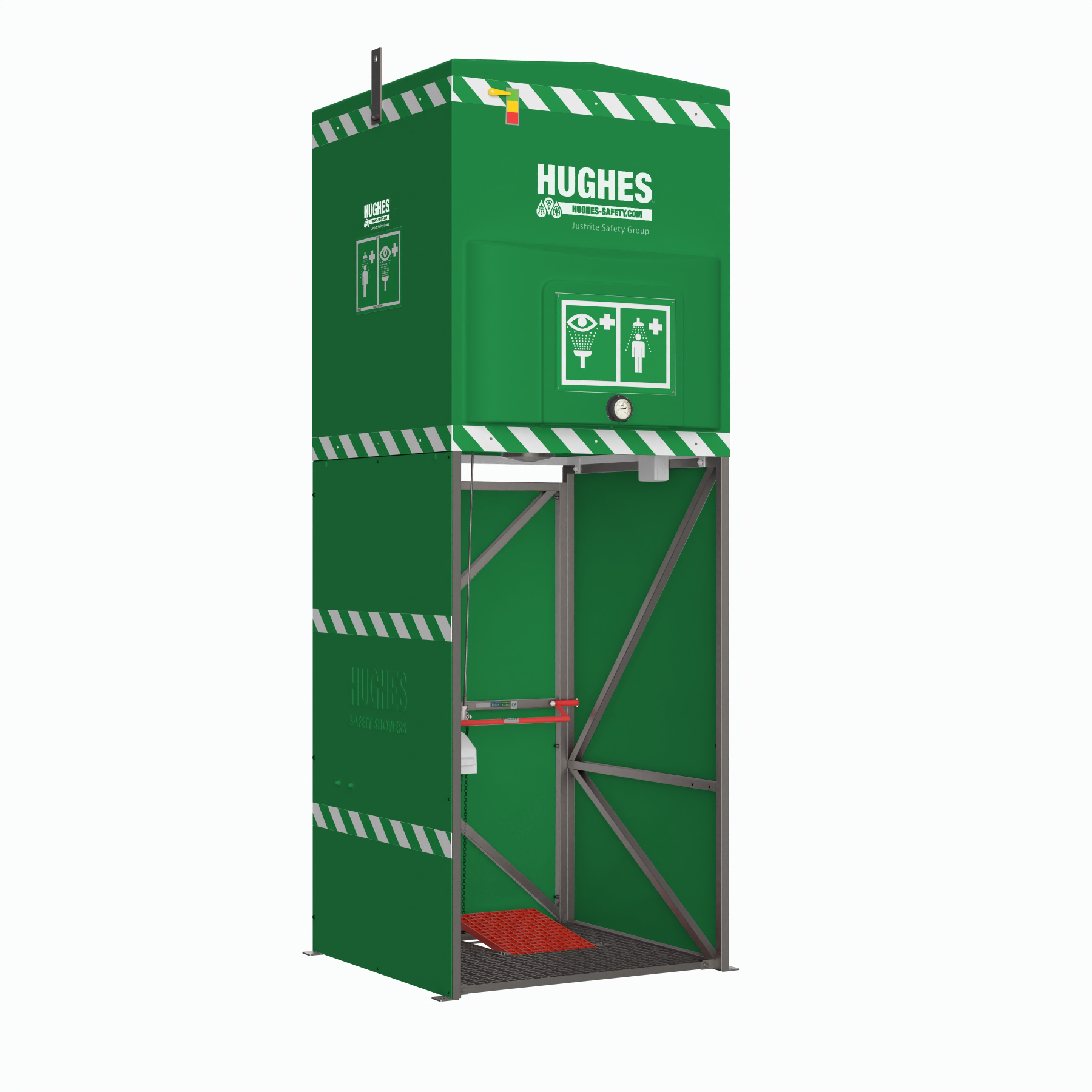 De tankdouche is voorzien een elektrisch verwarmingselement (240V) met weerstand en dubbele veiligheidsthermostaat. De regelthermostaat wordt ingesteld op 21°C. De nooddouche is aan de voorzijde uitgerust met een pictogrambox 'oog en nooddouche'. Optioneel kan verlichting worden voorzien in de pictogrambox.