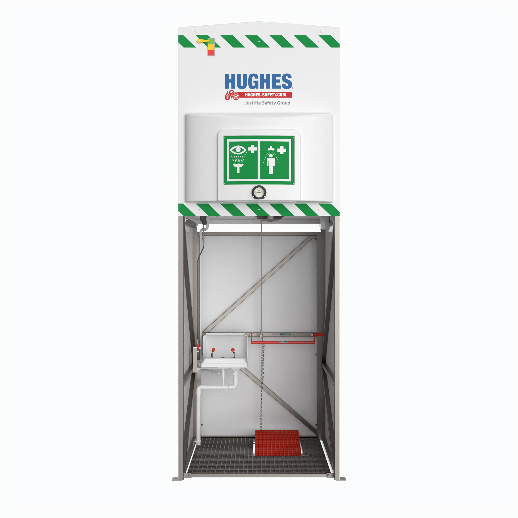 De tankdouche is voorzien een elektrisch verwarmingselement (240V) met weerstand en dubbele veiligheidsthermostaat. De regelthermostaat wordt ingesteld op 21°C. De nooddouche is aan de voorzijde uitgerust met een pictogrambox 'oog en nooddouche'. Optioneel kan verlichting worden voorzien in de pictogrambox.