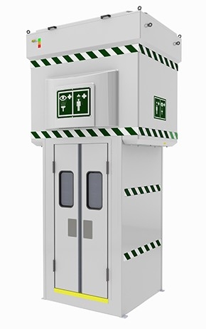 Daarnaast is deze tankdouche voorzien van geïsoleerde zijpanelen en klapdeuren met vensters en een opvangbak met afvoer voor het spoelwater. De op die manier gevormde cabine kan ook nog eens verwarmd worden zodat de gebruiker zich kan decontamineren in een verwarmde ruimte om onderkoeling te vermijden.