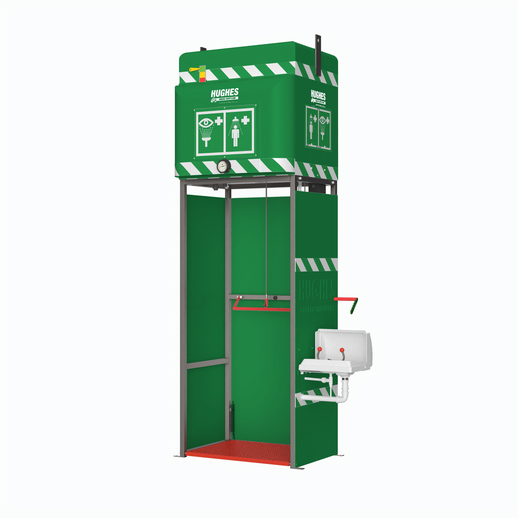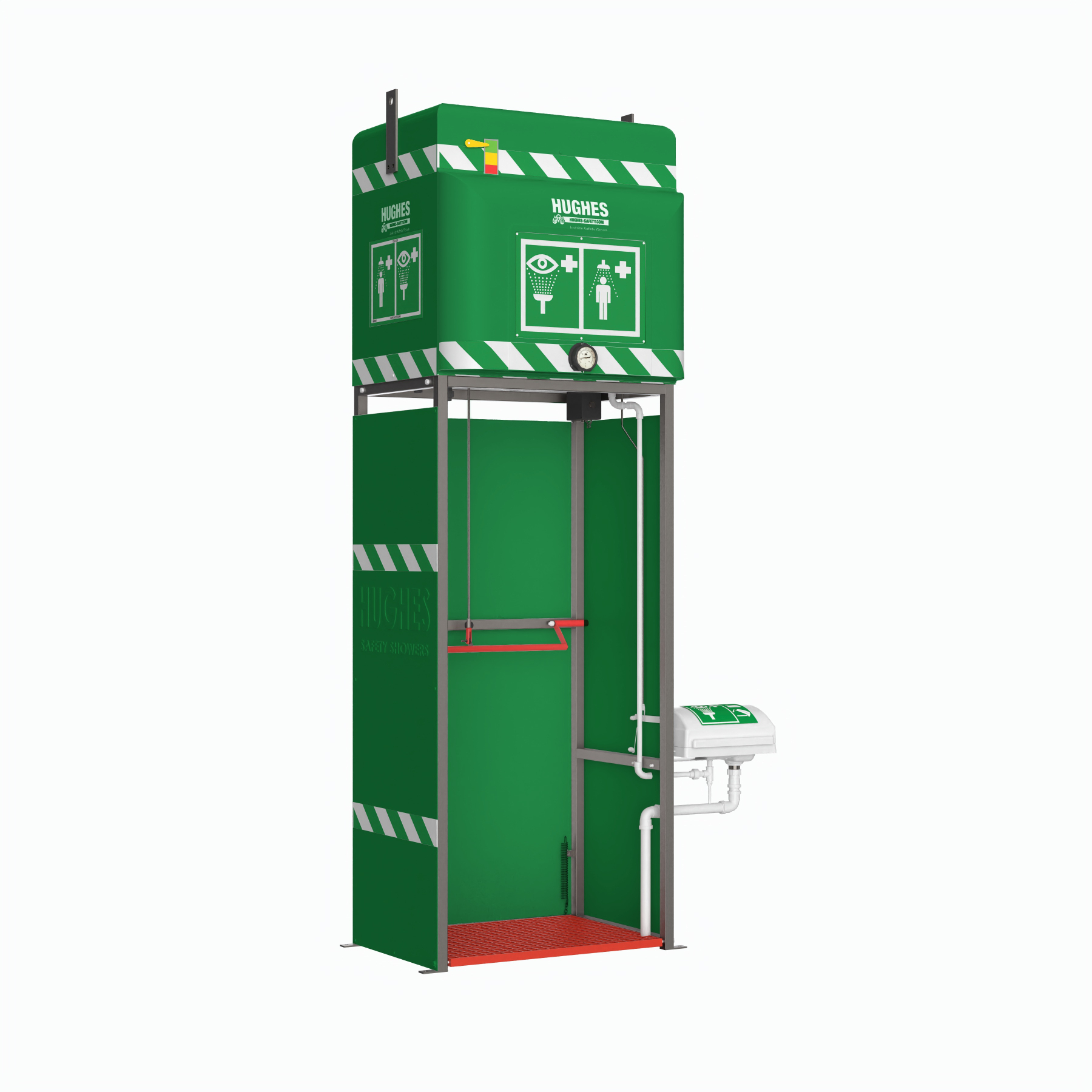 De tankdouche is voorzien een elektrisch verwarmingselement (240V) met weerstand en dubbele veiligheidsthermostaat. De regelthermostaat wordt ingesteld op 21°C. De nooddouche is aan de voorzijde uitgerust met een pictogrambox 'oog en nooddouche'. Optioneel kan verlichting worden voorzien in de pictogrambox.