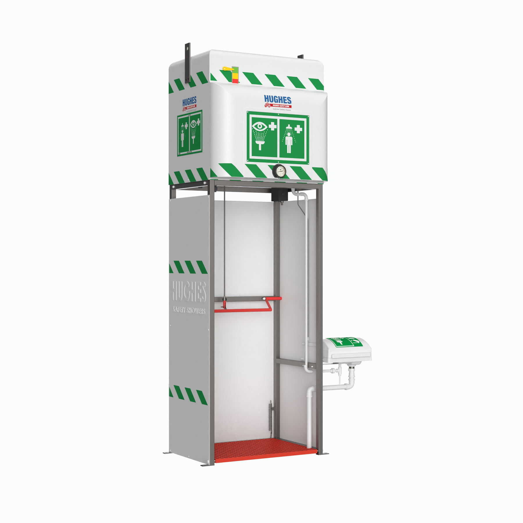 De tankdouche is voorzien een elektrisch verwarmingselement (240V) met weerstand en dubbele veiligheidsthermostaat. De regelthermostaat wordt ingesteld op 21°C. De nooddouche is aan de voorzijde uitgerust met een pictogrambox 'oog en nooddouche'. Optioneel kan verlichting worden voorzien in de pictogrambox.