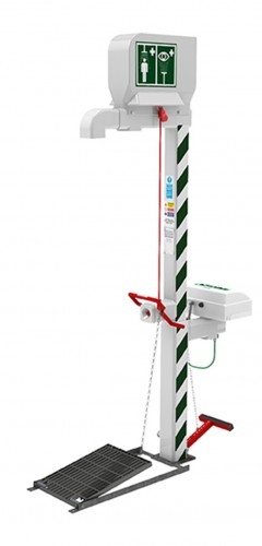 Tot -35°C elektrisch geïsoleerde vrijstaande nooddouche en gecombineerde oogdouche met roestvrij stalen (316) waterbuizen. De nooddouche is voorzien van een extra lichaamssproeier, waardoor de oogdouche aan de achterkant gemonteerd dient te worden. In de waterbuis bevindt zich een elektrisch verwarmingselement met een weerstand en dubbele thermostaat (240V). Daarrond is er een isolatie en een omkasting in witte polyethyleen met groen/witte veiligheidsstrepen. Bovenaan is er een pictogrambox voorzien, waar eventueel ook een lamp in geplaatst kan worden. Ook de thermostaat bevindt zich bovenaan in de pictogrambox. De plensdouche wordt geactiveerd door middel van een trekhendel. De zelfdrainerende oogdouche en gezichtsdouche met debietregelaar heeft een deksel en dekselactivering. Het deksel en de kom zijn gemaakt van glasvezelversterkt polyester. Het deksel zorgt er ook voor dat de binnenkant van de oogdouche en de sproeikoppen zuiver blijven. De binnenkant van het deksel is voorzien van een spiegel met de gebruiksinstructies. De activering gebeurt door het deksel te openen, na gebruik dient men het deksel te sluiten. Er is een bijkomende handsproeier/oogsproeier op flexibele slang om eventueel andere mensen te helpen behandelen. Leverbaar in Atex en niet-atex uitvoering. Andere beschikbare kleuren voor de omkasting : groen, oranje, geel en rood.