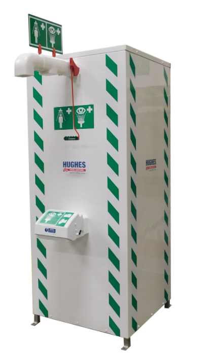 De plensdouche bovenaan bestaat uit RVS 316 waterleidingen, voorzien van elektrische tracing, isolatie en een buitenste omkasting uit polyethyleen. Activatie gebeurt via een trekhendel. De vorstvrije ABS-oogdouche met geïntegreerde debietregelaar wordt geactiveerd door het openen van het deksel. Omwille van het deksel blijft de oogdouche gevrijwaard van vuil en stof. De interne waterleidingen zijn vervaardigd uit RVS 316. De buitenkast bestaat uit glasvezelversterkt polyester. De aangebrachte veiligheidspictogrammen voldoen aan de geldende internationale normen.