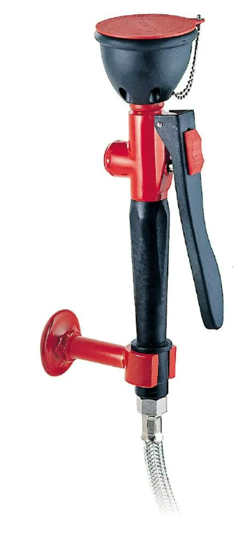 De activering gebeurt door een druk op de zwarte duwhendel. Na gebruik sluit met de oogdouche een druk op de groene knop. De beschermkap wordt automatisch verwijderd door de druk van het water.