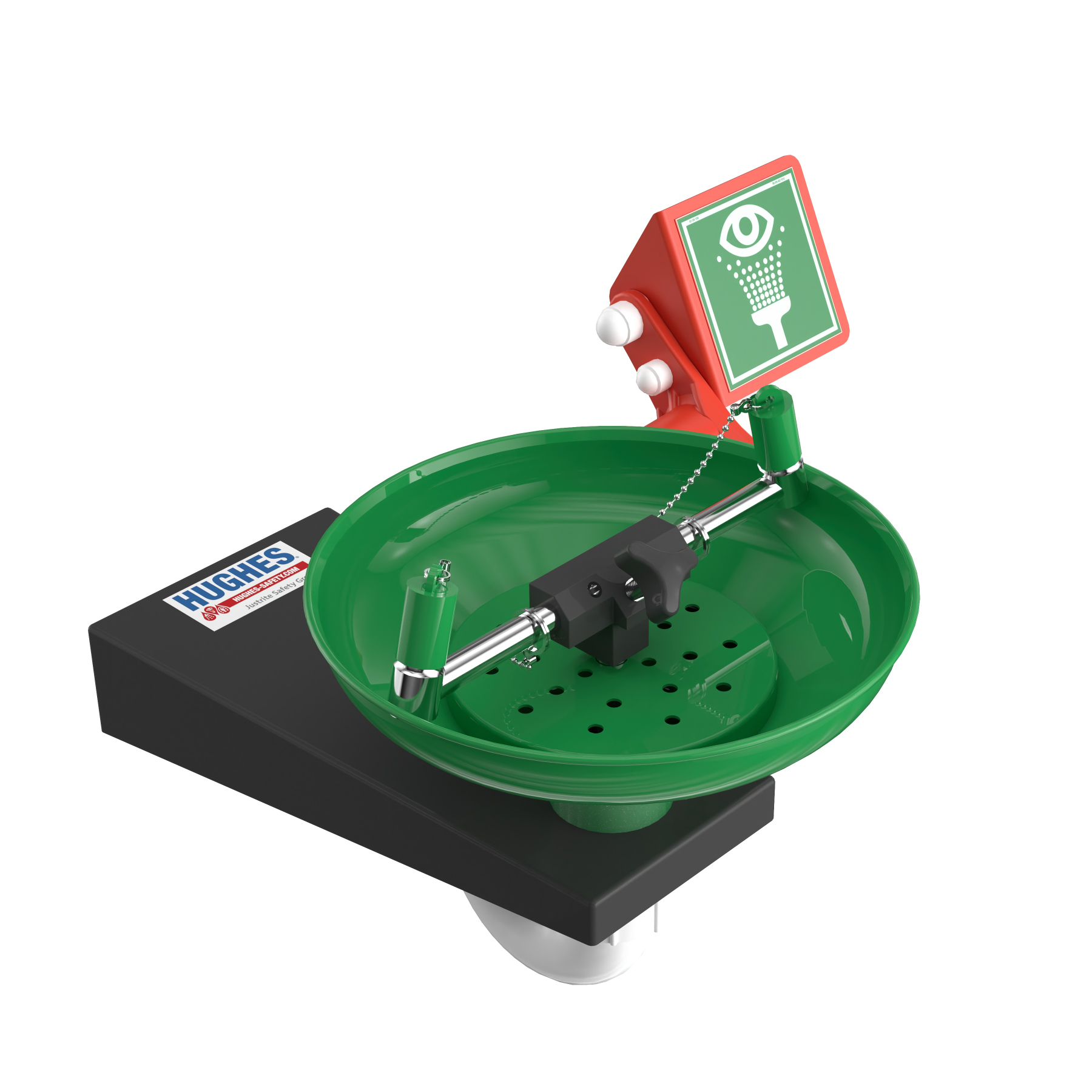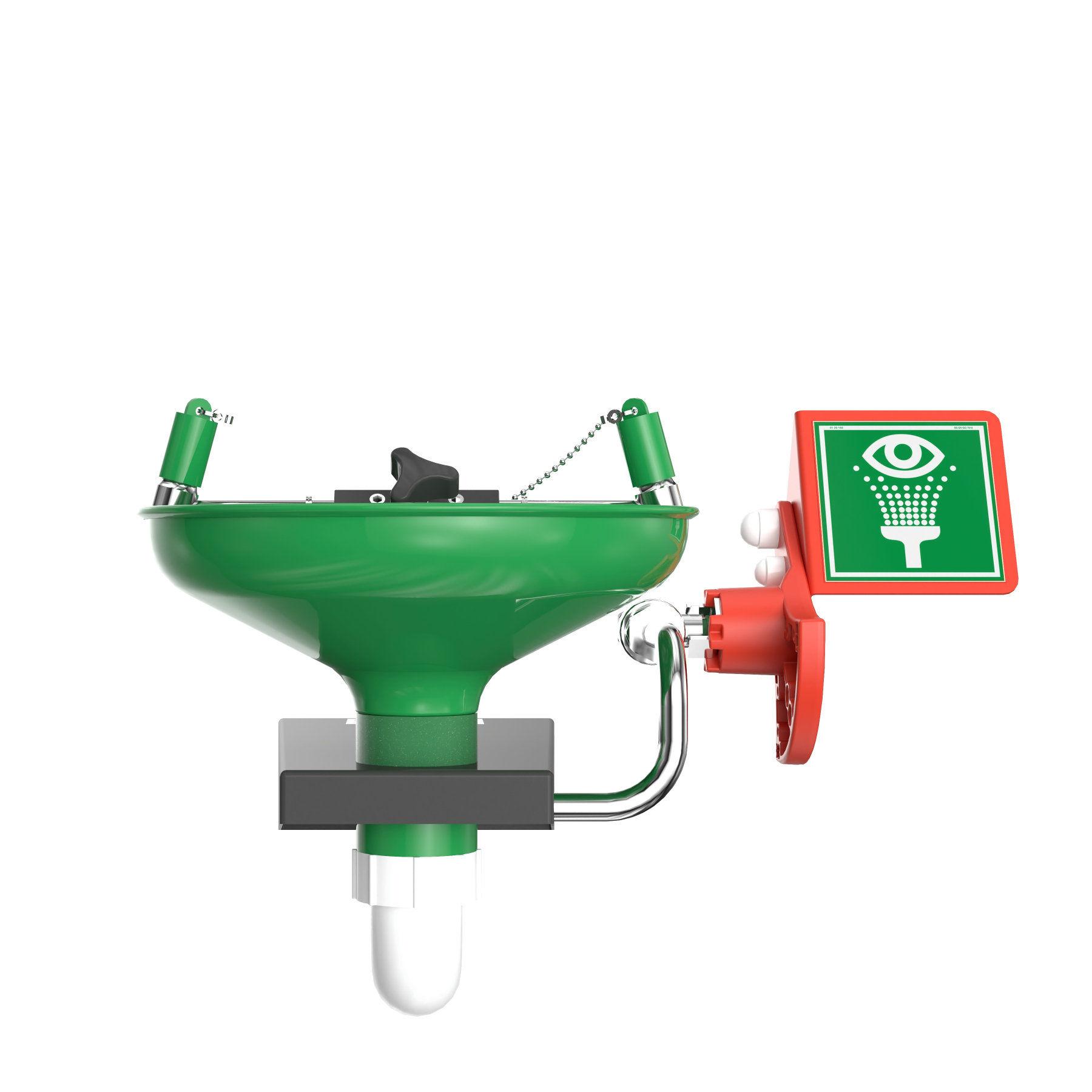Open oogdouche uit RVS met debietregelaar voor muurbevestiging. De kom is voorzien van een groene corrosie werende polyestercoating. De oogdouche met RVS 316 afsluiter wordt geactiveerd door een duwhendel. Door de kracht van de waterdruk worden de afdekkapjes op de sproeikopjes van de oogdouche automatisch verwijderd. Onderaan de oogdouche is schroefdraad voorzien zodat een afvoerpijp eventueel gemonteerd kan worden.