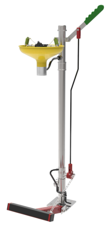 Zelfdrainerende, open oogdouche uit gele ABS met debietregelaar gemonteerd op een gegalvaniseerd stalen en groengelakte sokkel. De oogdouche met RVS 316 afsluiter wordt geactiveerd door een hendel. Door de kracht van de waterdruk worden de afdekkapjes op de sproeikopjes van de oogdouche automatisch verwijderd. De afsluiter zit onderaan de oogdouche en is gemaakt van RVS 316. Na gebruik loopt de oogdouche volledig leeg via een 'bleed pipe', waardoor er achteraf geen water in de standpijp achter blijft.