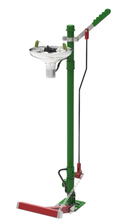Zelfdrainerende, open oogdouche uit RVS met debietregelaar gemonteerd op een gegalvaniseerd stalen en groengelakte sokkel. De oogdouche met RVS 316 afsluiter wordt geactiveerd door een hendel. Door de kracht van de waterdruk worden de afdekkapjes op de sproeikopjes van de oogdouche automatisch verwijderd. De afsluiter zit onderaan de oogdouche en is gemaakt van RVS 316. Na gebruik loopt de oogdouche volledig leeg via een 'bleed pipe', waardoor er achteraf geen water in de standpijp achter blijft.