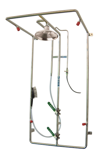 Tweefasige decontaminatiedouche voor muurmontage voor binnenopstelling met de mogelijkheid van een eerste reiniging met een detergent, gevolgd door een reiniging enkel met zuiver water. Er is een sproeiroos bovenaan, een sproeiborstel voor de eerste reiniging met water en detergent. Daarnaast zijn er nog 4 sproeikoppen voor de 2de reiniging met zuiver water. De sproeiroos en de borstel worden geactiveerd met de 1ste hendel, de naspoeling met zuiver water met de 2de hendel. Dit type wordt geproduceerd in roestvrij staal.
