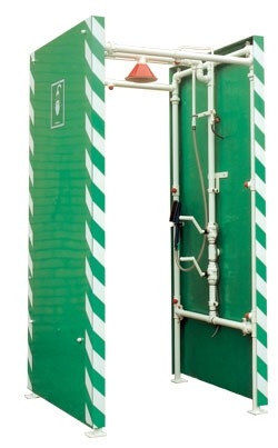Dubbelfasige decontaminatiedouche voor binnenopstelling (ene kant in en andere kant uit) met de mogelijkheid van een eerste reiniging met een detergent, gevolgd door een reiniging enkel met zuiver water. Er zijn 10 sproeikopjes voorzien voor een gelijkmatige afspoeling. De activering gebeurt door middel van een hendel. De waterbuizen zijn in roestvrij staal. De zijwanden zijn gemaakt uit groene glasvezelversterkte polyester panelen.