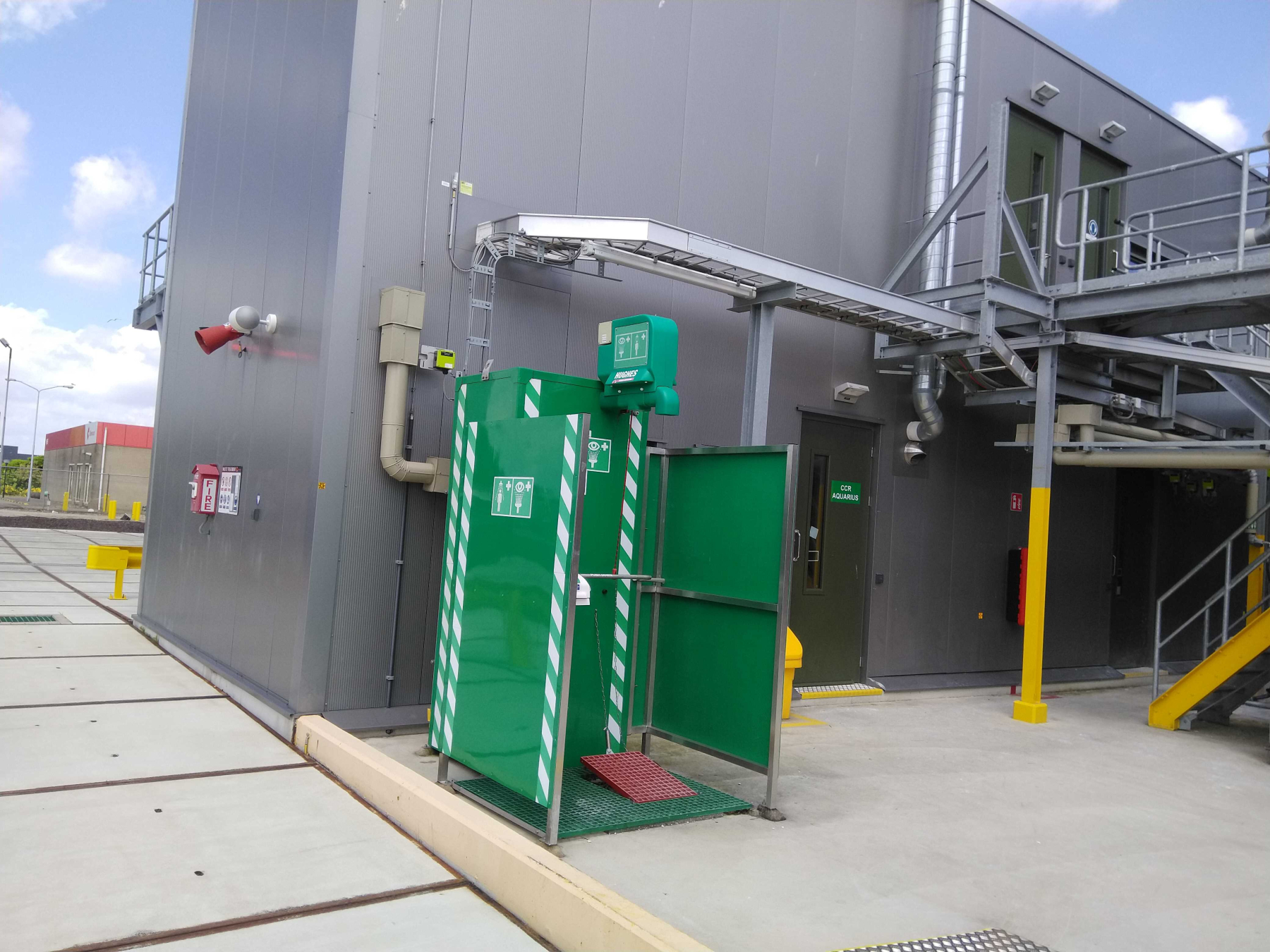 Bij een chemische fabriek in Dordrecht, gespecialiseerd in de productie van fluorpolymeren leverden we in de loop der jaren 13 boilernooddouches in de kleur groen, uitgevoerd met zijpanelen. De oog- en nooddouches leveren verwarmd water gedurende 15 minuten, volledig conform EN-15154-5. De zijpanelen bieden extra bescherming tegen wind en tocht, waardoor veilig en comfortabel gebruik mogelijk is.