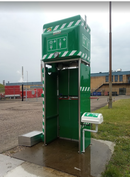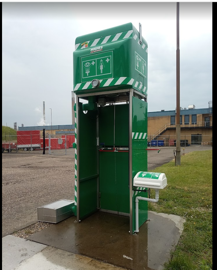 Een olieraffinaderij uit Nieuwdorp koos voor een 350-liter tankdouche met verwarmd water, die een gebruiker gedurende 4,5 minuten voorziet van verwarmd water. De tankdouche kreeg een opvallende groene kleur en is uitgerust met een oogdouche aan de buitenzijde van de unit voor directe spoeling bij oogincidenten. Bovendien is de unit voorzien van een alarmmelding naar de controlekamer, zodat bij gebruik direct kan worden gereageerd.