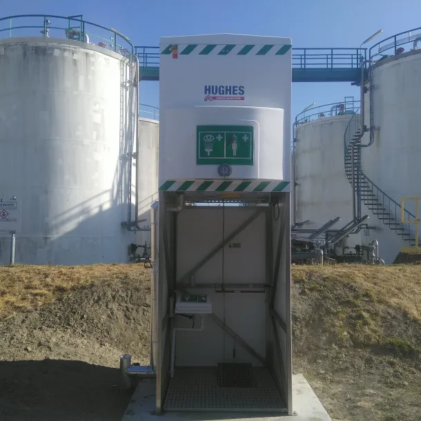 De nooddouche van het type EXP-MH-14KS/1500 biedt gebruikers direct, en gedurende 20 minuten verwarmd water, wat essentieel is voor een snelle en effectieve spoeling bij een chemisch of thermisch incident. Dit type nooddouche voldoet volledig aan de geldende normen EN-15154-5 en AnsiZ 358.1, waardoor de hoogste standaarden op het gebied van veiligheid en gebruiksgemak gegarandeerd zijn. Er werd gekozen om het pictogram te verlichten en werd geopteerd om een lokaal alarm met sirene en flitslicht te voorzien op de tankdouche. Dit alarm wordt geactiveerd bij gebruik van de oog- en/of nooddouche.